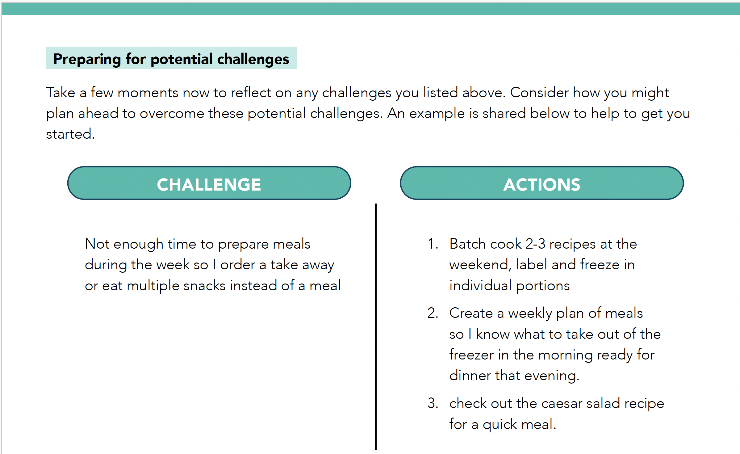 You kick off your 10 step plan by undertaking an activity to explore your hopes and expectations of dietary change. We encourage you to consider the challenges you might face and to consider how you can overcome these.